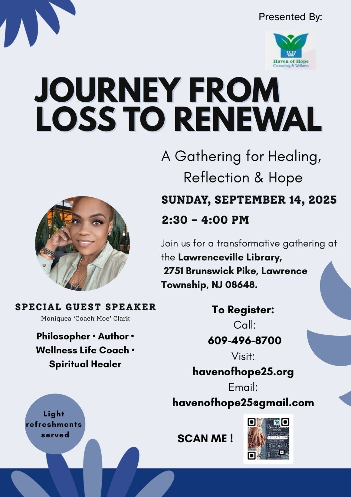 Join us for a healing and reflective gathering on Sunday, September 14, 2025, from 2:30–4:00 PM at the Lawrenceville Library. Special guest speaker Moniquea “Coach Moe” Clark will share insights on healing, renewal, and hope.